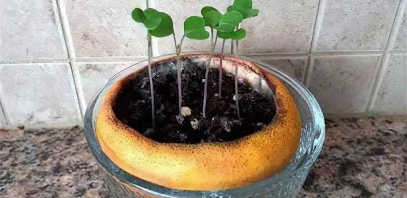 Апельсинова шкірка — це готовий біорозкладний горщик для насіння. Вона містить корисні речовини, як-от азот і калій, які підживлюють молоді рослини на самому початку їхнього росту.