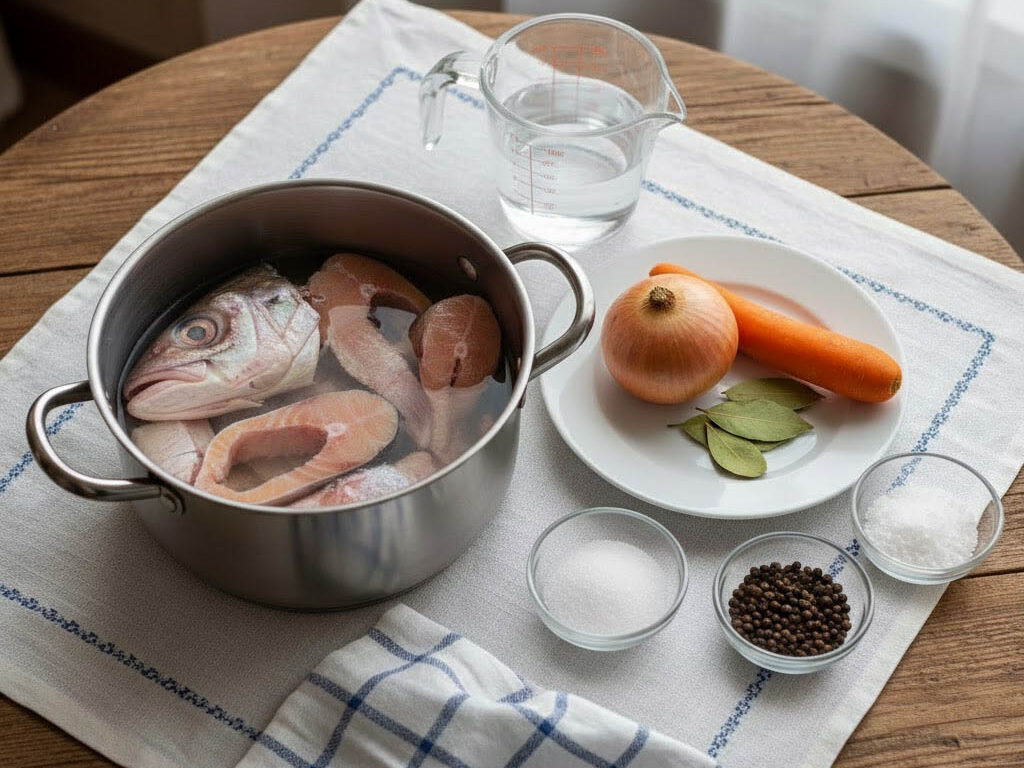 ✅ Підготовка: Почисть цибулю та моркву. Добре промий рибний набір.
